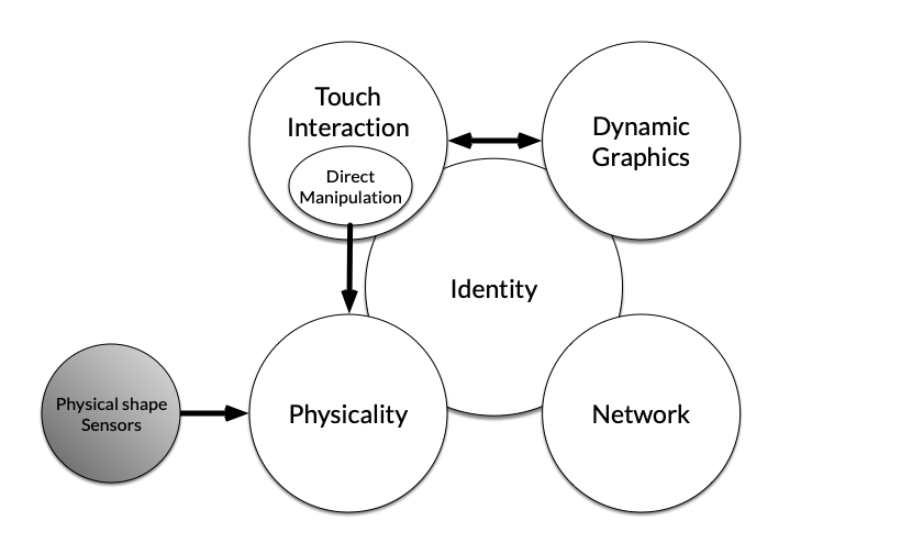 In our understanding, mobile interaction is a synthesis of touchscreen interaction and its immediate consequent direct manipulation, dynamic graphics, physicality, networked communication, and identity (Figure 1.1).