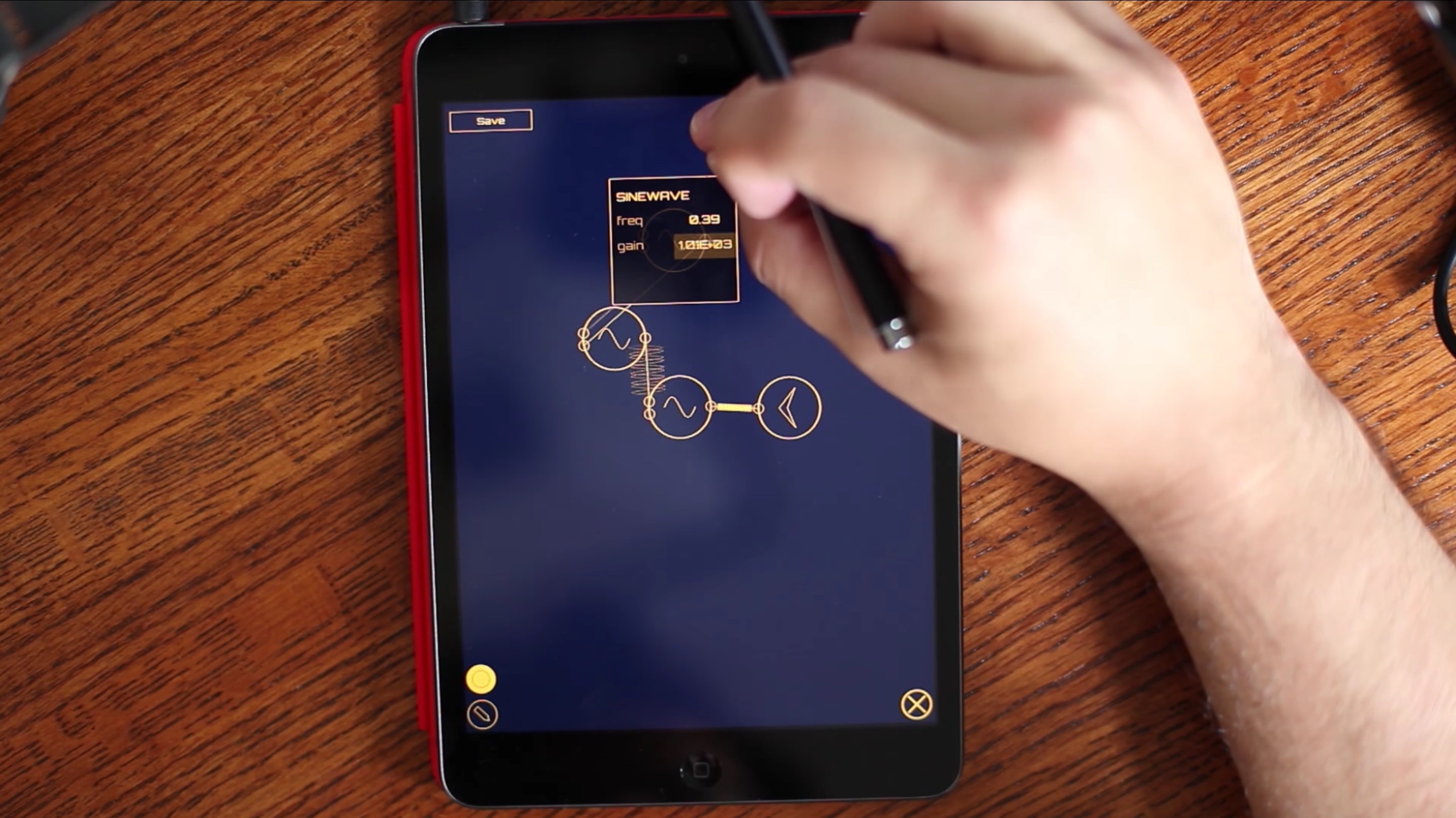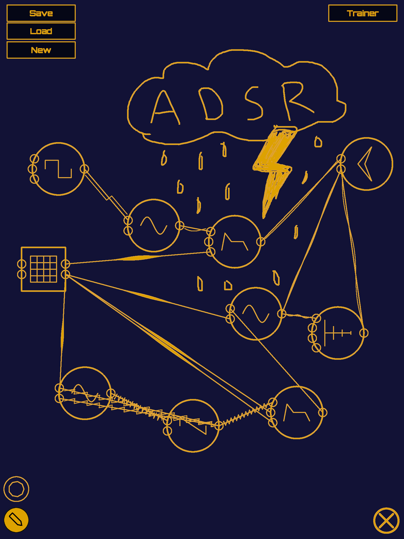 Perhaps the most critical component of the design is the interactions themselves, how a series of touches or stylus strokes map to a resulting state of the software. Participants in the user studies for Auraglyph appreciated the sketch-oriented, stream of consciousness approach to designing musical programs (so long as the handwriting recognition actually worked). Auraglyph was compared favorably in some aspects to similar software such as Pure Data, Reaktor, or digital audio workstations; despite having far less functionality than these systems, Auraglyph succeeded at presenting the functions it did have in an approachable and inviting way. When users speak of the diverse sonic possibilities and so-called “destructive creativity” that Auraglyph enables, they don’t mean that Auraglyph implements some fundamentally different way of achieving audio synthesis or music composition. On the contrary, its fairly basic set of operators consists chiefly of standard waveforms, basic filters, an ADSR envelope, delay, and white noise. Rather, the way that these basic elements are presented and how users are guided to interact with them—the design of the software—suggests these broad sonic capabilities and interactions.