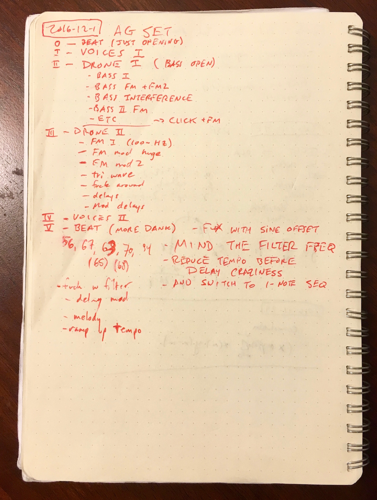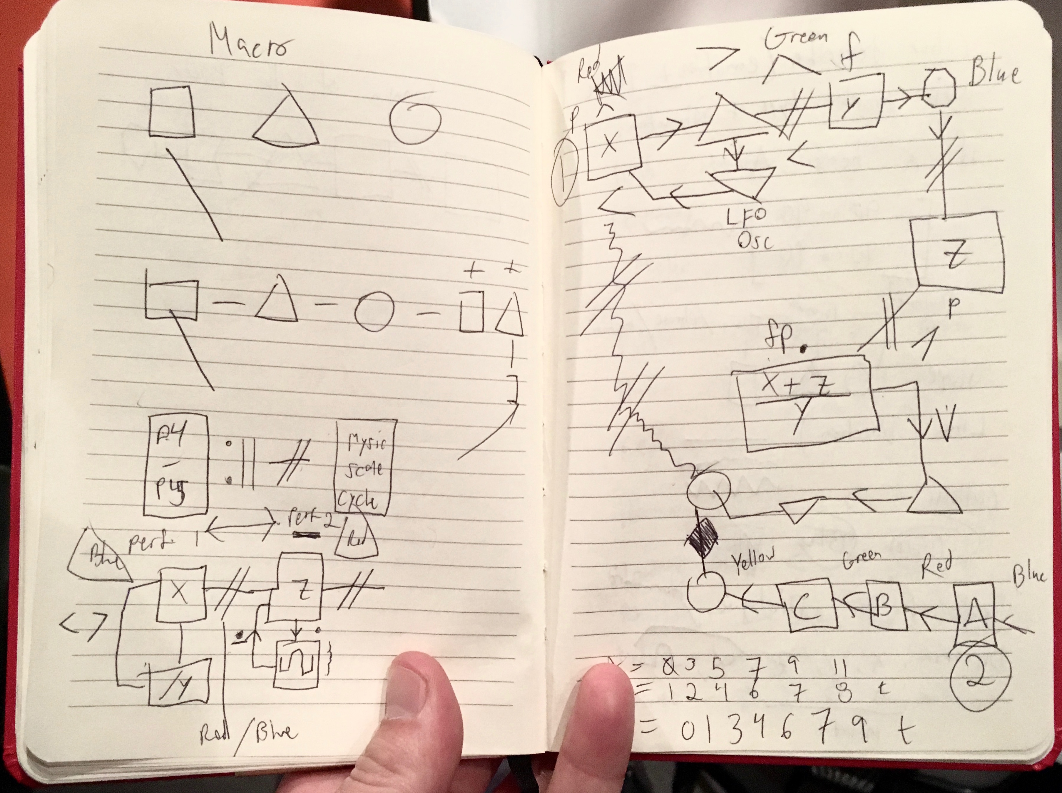 Working with Auraglyph was also interesting in the context of Trueman’s concept of performative attention [6], or more generally how much work must be done to achieve a desired musical result. Performing these pieces was a combination of parameterizing and reconfiguring a pre-made patch in addition to extending that patch with new nodes and connections, or creating a new patch from scratch. This required documentation of the procedures needed to progress a piece as planned, and careful execution of these instructions. The “score” for the author’s performance can be seen in Figure 1.12. Rather than simply running prearranged buffers of code or triggering loops, significant parts of the program had to be built live during the performance in a process similar to live coding. Performing with Auraglyph required a mentally active process of recreating a program based on a model designed and rehearsed prior to the performance. This left room for plenty of mistakes to be made; instructions in all-capital letters in the score in Figure 1.12 were largely warnings of pitfalls in this process that would lead to undesirable musical results. In an extreme case, “MIND THE FILTER FREQ” warns to ensure that a filter frequency is not modulated below zero, which due to a software bug would have caused it to short-circuit the entire audio path.5