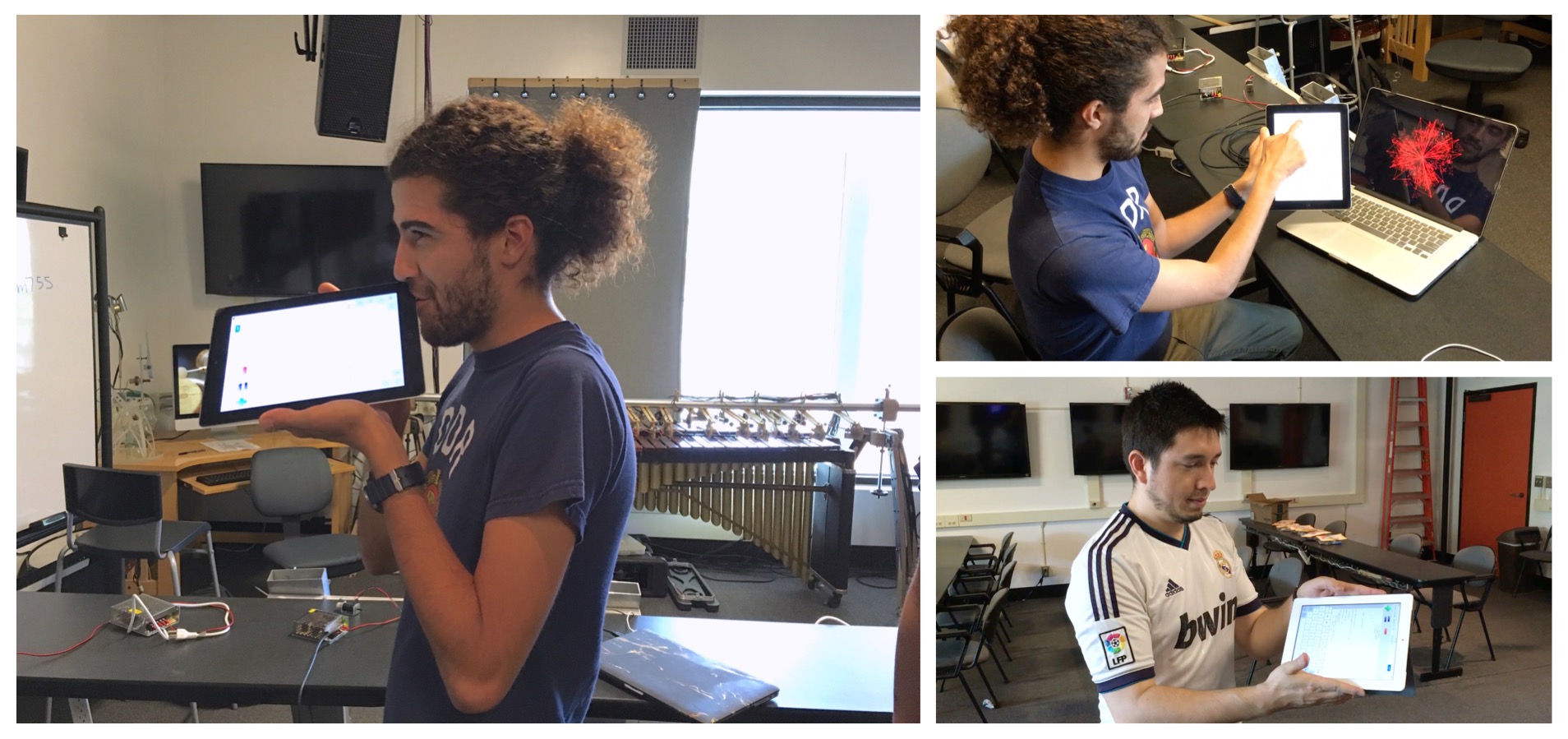 Among the creations presented at the end of the user study were a drone activated by voice or breath input fed into multiple delays, a feedback network driven by oscillators and controlled by motion sensors, an accelerometer-based shake controller for the Synthesis ToolKit’s “Shakers” physical model [2], a motion-controlled “cello,” and an audio analysis system that drove desktop-based visuals (Figure 1.1). A number of these leveraged the ChucK Mobile API to achieve these features, and in some cases leaned on the physical properties of the device itself for their interaction.