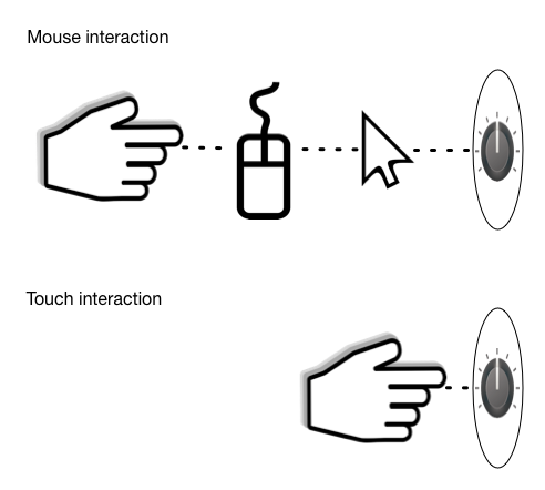 Direct manipulation allows users of creative software to interact directly with objects on-screen, narrowing the divide between physical reality and digital abstraction. While this can be used to augment simple physical metaphors, like the knobs and sliders popular in musical applications, it can also facilitate richer interactions beyond what is possible in the physical realm. This contrasts with conventional desktop computer interaction, in which the mouse cursor distances the user from the activities that occur in the underlying virtual space. Figure 1.6 visually demonstrates these comparative distances. This naturalistic form of interaction greater leverages its users’ preexisting intuitions about the world. The resulting intuitiveness not only makes it easier for novices to learn a new set of interactions, but makes simple actions require less thinking for experienced users, allowing more sophisticated interactions to be built on this intuitive foundation.