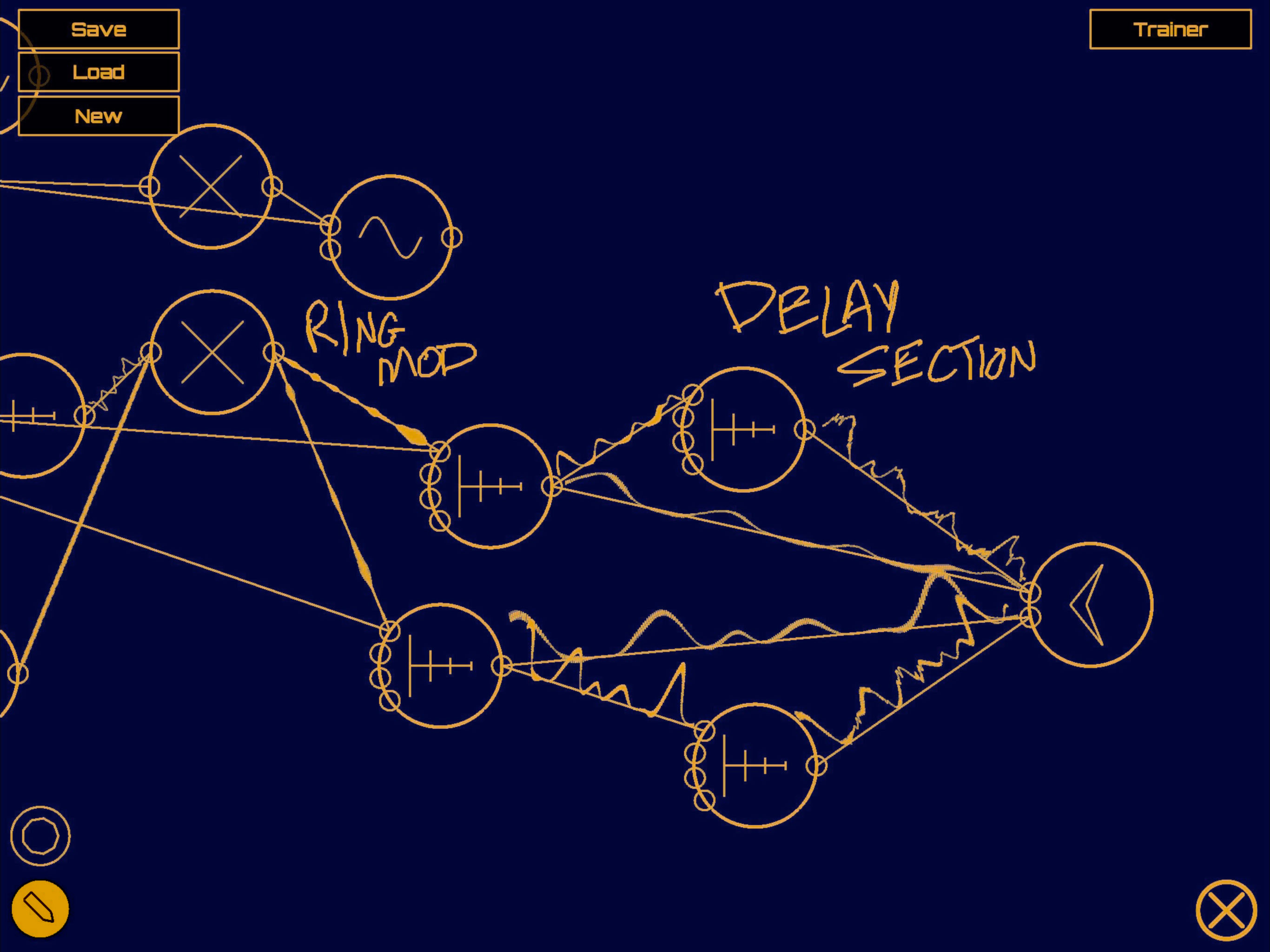 Stylus input is used for original input of structures. These structures are then converted from raw pen strokes to objects in the system of a specified class and carrying adjustable characteristics. The class is determined by the form of the raw input and the current mode the software is in. For instance, drawing a circle form in the base mode of the app creates an audio generator node. Drawing an arbitrary figure in the waveform editor creates an oscillator with that waveform.
